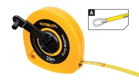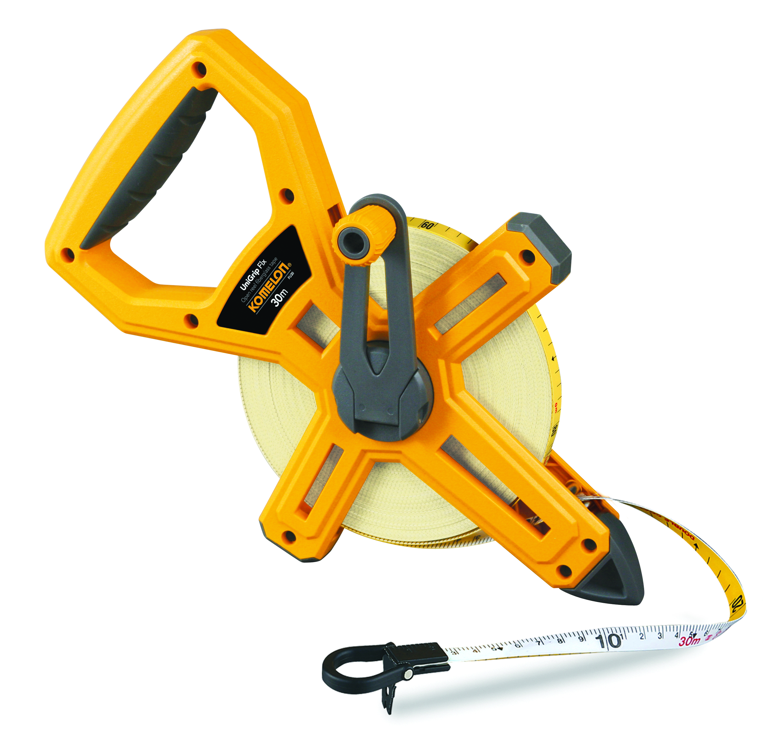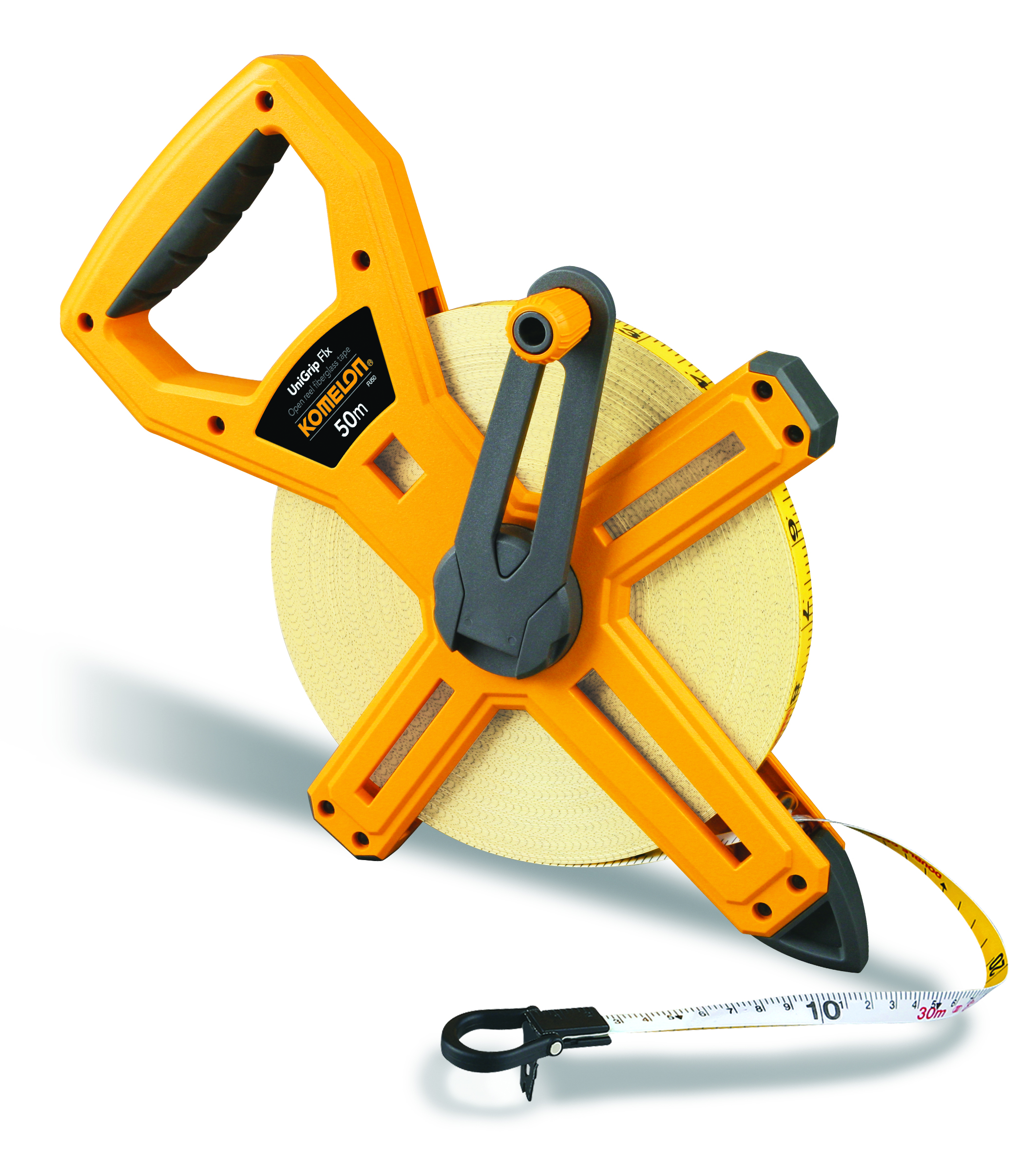 Dupla nejlon bevonatú üvegszálas mérőszalag, rendkívül strapabíró, behajtható feltekerő fogantyúval, ütésálló gumibetétes kerettel.