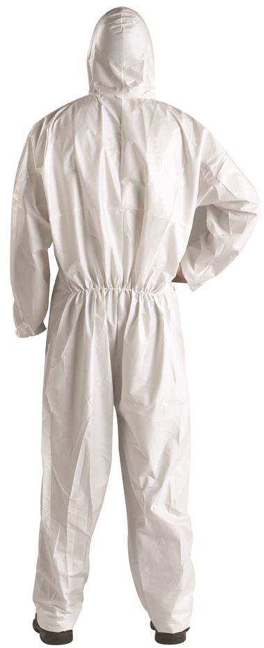 Egyszer használatos védőruha kapucnival, nem ereszti a szálakat, kétnyílású cipzár sliccel, az ujjak, nadrágszár,