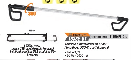 Tölthető akkumulátor az 1838E lámpához, USB-C csatlakozóval