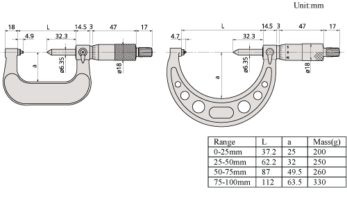 Fix ülékkel Közvetlenül a menetköz és átmérő méréséhez, nincs szükség átszámításra. Jellemzők Tartomány:75 - 100 mm Mérhető menettípus (Metrikus/coll):3,5 - 5 mm Tömeg:330 g Síklapúság:0,01 mm Szállítva: dobozban, kulccsal, beállító etalonnal