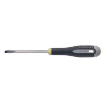 Hagyományos 'hornyolt' markolat. Selyemfényű, edzett és köszörült króm ötvözetből készült penge. Ez a csavarhúzó típus nyújtja a legszélesebb választékot. Olaj-, sav- és ütésálló műanyag markolat.