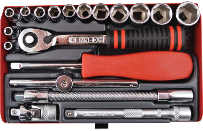 Kiegészítők: racsnis hajtószár, csuklós hajtószár, T-hajtószár, univerzális csukló, 75 mm-es standard hosszabbító, 150 mm-es gömbvégű hosszabbító. Mágnesbetétes tároló rekesz. Patentra csukódó erős tárolódoboz, ergonomikus fogantyú, lakatfül.