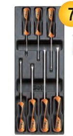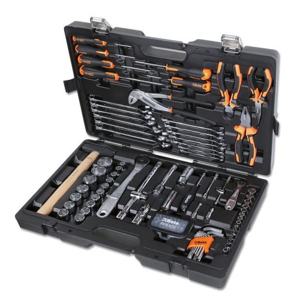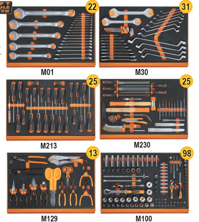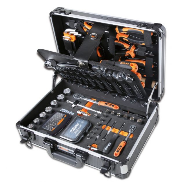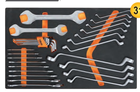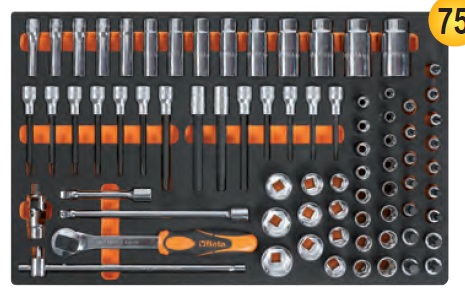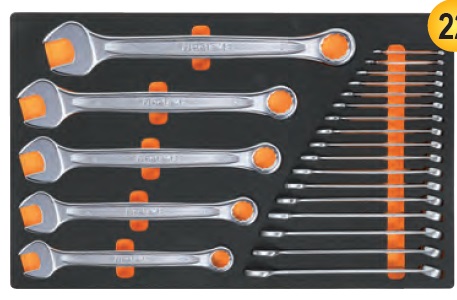 Mennyiség/megnevezés Beta N. TR 21 csillag-villáskulcsok 6-7-8-9-10-11-12-13-14-15-16-17-18-19-20-21-22-24-27- 30-32 mm 42 T05 +T06 8 villáskulcs 6x7-8x9-10x11-12x13-14x15 55 T33 9 9 darabos hatszögű imbuszkulcskészlet  1,5÷10 mm 96/SC9 T33 6 T-szárú imbuszkulcs műanyag markolattal  2-2,5-3-4-5-6 mm 96T T52 8 csuklós T-kulcs  7-8-10-12-13-14-17-19 mm 952 T63 19 1/2”-os hatlapú dugókulcs  10-11-12-13-14-15-16-17-18-19-20-21-22-23-24- 26-27-30-32 mm 920A T83 1 1/2”-os toldó 125 mm 920/21 T83 1 1/2”-os toldó 255 mm 920/22 T83 1 1/2”-os csukló 920/25 T83 1 1/2”-os csúszkás T-hajtószár 305 mm 920/42 T83 1 1/2”-os irányváltós racsni  920/55 T83 1 oldalcsipőfogó  160 mm 1084BM T137 1 kombinált fogó  180 mm 1150BM T137 1 extra hosszú félkerekcsőrű fogó  160 mm 1166BM T137 1 seeger-fogó, egyenes belső, foszfátozott  180 mm 1032 T145 1 seeger-fogó, 90°-os hajlított belső, foszfátozott  170 mm 1034 T145 1 seeger-fogó, egyenes külső, foszfátozott  175 mm 1036 T145 1 seeger-fogó, 90°-os hajlított külső, foszfátozott  175 mm 1038 T145 1 Egyenes pofájú önzáró fogó 240 mm 1052 T153 1 vízpumpafogó 250 mm 1048N T153 7 csavarhúzó hasítottfejű csavarokhoz  2,5x50 -3x75 - 3,5x100 - 4x125 -5,5x100 - 5,5x150 - 6,5x150 mm 1260 T199 6 Phillips®-csavarhúzó  PH0x60 - PH0x100 - PH1x80 - PH1x120 - PH2x100 - PH2x150 mm 1262 T202 2 erősített laposvágó 100-200 mm 35 T234 1 lakatos kalapács 300 g 1370 T234 1 műanyag kalapács Ø 35 mm 1390 T234 1 hőformált szerszámtartó VP5