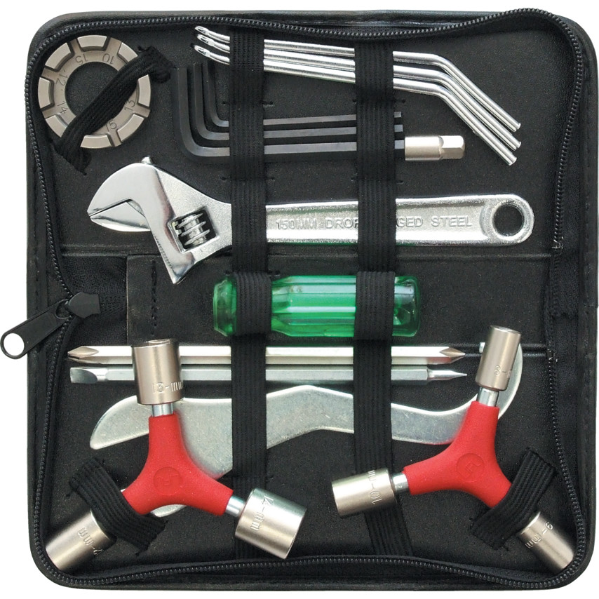 Tartalma: 2xY dugókulcs 8/9/10 és 12/13/14mm; állítható kulcs, Kampós+15-16mm villás kulcs; PH1/PH2/4,0/6,0mm csavarhúzó; 4/5/6/8(adapter)mm hatszögkulcs; küllőkulcs; 3x szerelővas