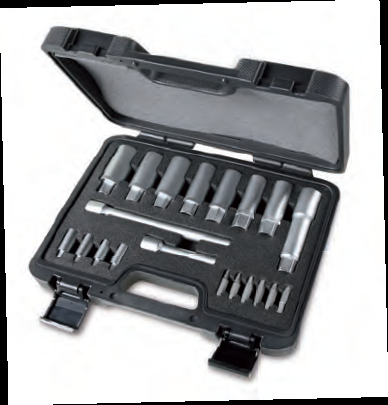 Készlet tartalma: • 7 hatlapú dugókulcs, méretek: 16 - 17 - 18 - 19 - 21 - 22 - 24 • 1 hosszabbító, hossz: 120 mm • 3 belső nyílású bit, méretek: 8x5 - 8x6 - 11x8 • 1 belső imbusz bit, méret: 10 mm • 1 XZN® bit, méret: M10 • 1 Torx® bit, méret: T50 • 4 imbusz bit, méret: 5- 6 - 7 - 8 • 1 bittartó hosszabbító, hossz: 95 mm • 1 bittartó hosszabbító, hossz: 190 mm  320x245x71 mm -  2,6 kg