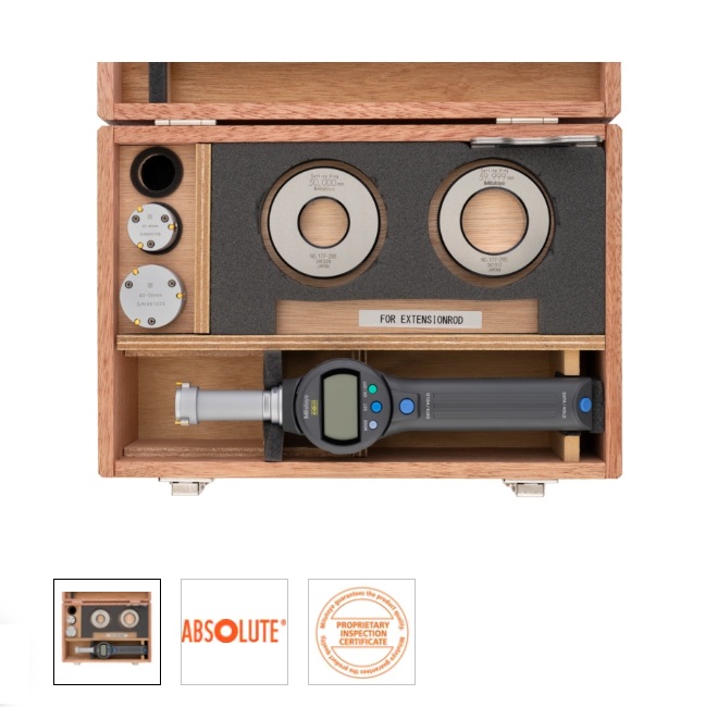 3-ponton mérő Digimatic furatmérő eszköz. Mindegyik készlet rendelkezik egy alaptesttel és cserélhető mérőfejekkel.